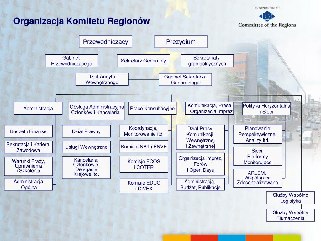 Organizacja Komitetu Regionów Przewodniczący Prezydium Gabinet Przewodniczącego Sekretarz Generalny Sekretariaty grup politycznych Dział Audytu Wewnętrznego Gabinet SekretarzaGeneralnego Administracja Obsługa AdministracyjnaCzłonków i Kancelaria Prace Konsultacyjne Komunikacja, Prasa i Organizacja Imprez Polityka Horyzontalnai Sieci Koordynacja, Monitorowanie itd. Dział Prasy,Komunikacji Wewnętrzneji Zewnętrznej PlanowaniePerspektywiczne, Analizy itd. Budżet i Finanse Dział Prawny Komisje NAT i ENVE Usługi Wewnętrzne Rekrutacja i Kariera Zawodowa Sieci, PlatformyMonitorujące Organizacja Imprez,Forów i Open Days Komisje ECOSi COTER Kancelaria,Członkowie,DelegacjeKrajowe itd. Warunki Pracy,Uprawnieniai Szkolenia ARLEM, WspółpracaZdecentralizowana Administracja Ogólna Komisje EDUCi CIVEX Administracja, Budżet, Publikacje Służby Wspólne Logistyka Służby Wspólne Tłumaczenia