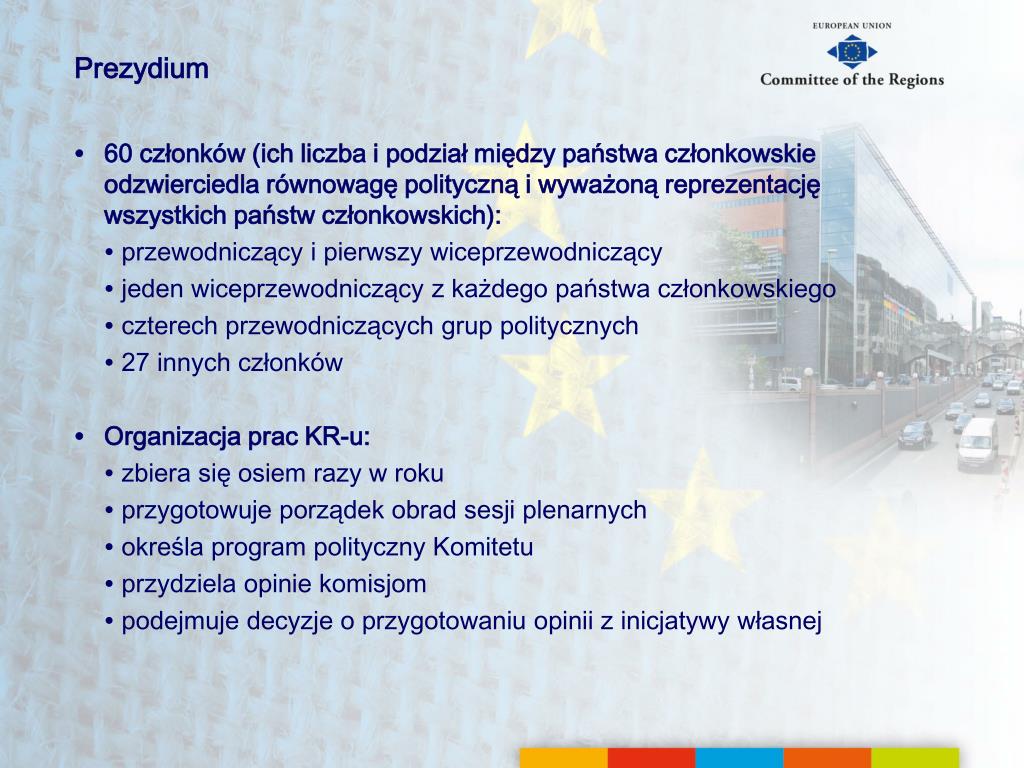 Prezydium ∙ 60 członków (ich liczba i podział między państwa członkowskie odzwierciedla równowagę polityczną i wyważoną reprezentację wszystkich państw członkowskich): ∙przewodniczący i pierwszy wiceprzewodniczący ∙jeden wiceprzewodniczący z każdego państwa członkowskiego ∙czterech przewodniczących grup politycznych ∙27 innych członków ∙ Organizacja prac KR-u: ∙zbiera się osiem razy w roku ∙przygotowuje porządek obrad sesji plenarnych ∙określa program polityczny Komitetu ∙przydziela opinie komisjom ∙podejmuje decyzje o przygotowaniu opinii z inicjatywy własnej