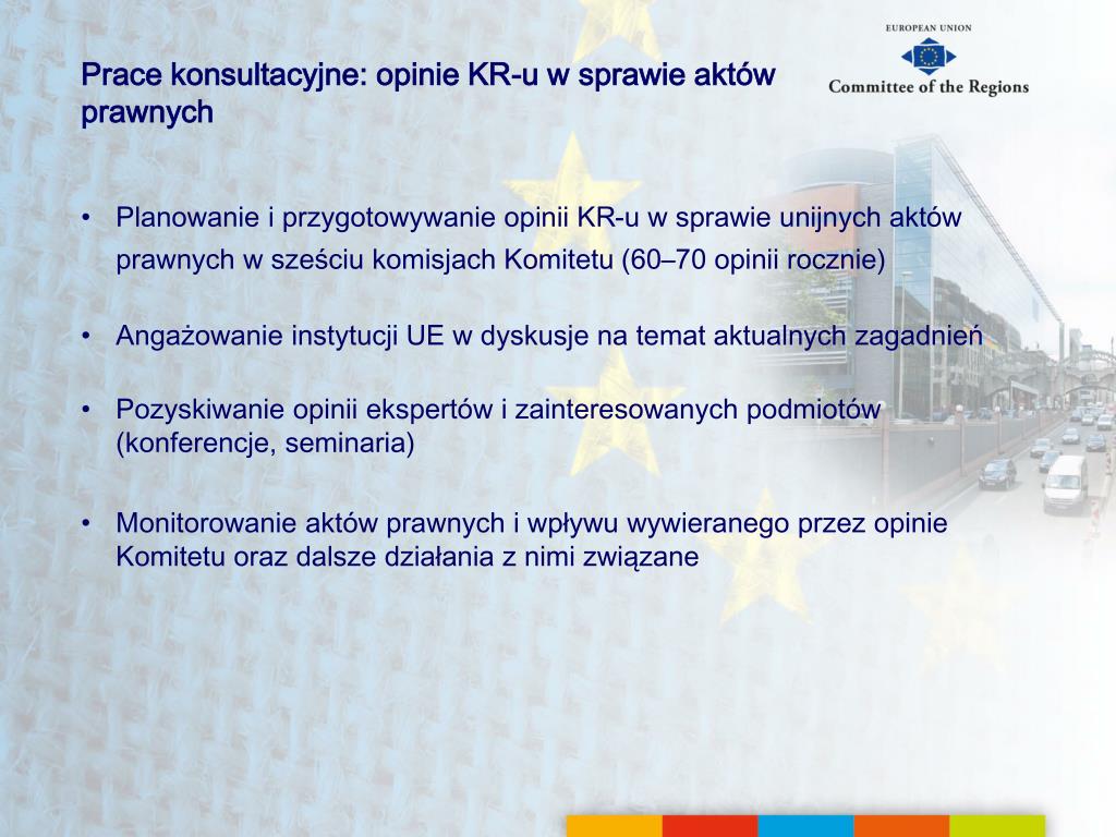 Prace konsultacyjne: opinie KR-u w sprawie aktów prawnych • Planowanie i przygotowywanie opinii KR-u w sprawie unijnych aktów prawnych w sześciu komisjach Komitetu(60–70 opinii rocznie) • Angażowanie instytucji UE w dyskusje na temat aktualnych zagadnień • Pozyskiwanie opinii ekspertów i zainteresowanych podmiotów(konferencje, seminaria) • Monitorowanie aktów prawnych i wpływu wywieranego przez opinieKomitetu oraz dalsze działania z nimi związane