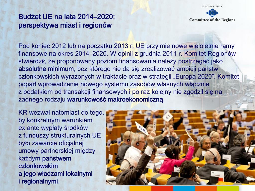 Budżet UE na lata 2014–2020:perspektywa miast i regionów Pod koniec 2012 lub na początku 2013 r. UE przyjmie nowe wieloletnie ramy finansowe na okres 2014–2020. W opinii z grudnia 2011 r. Komitet Regionów stwierdził, że proponowany poziom finansowania należy postrzegać jako absolutne minimum, bez którego nie da się zrealizować ambicji państw członkowskich wyrażonych w traktacie oraz w strategii „Europa 2020”. Komitet poparł wprowadzenie nowego systemu zasobów własnych włącznie z podatkiem od transakcji finansowych i po raz kolejny nie zgodził się na żadnego rodzaju warunkowość makroekonomiczną. KR wezwał natomiast do tego, by konkretnym warunkiem ex ante wypłaty środków z funduszy strukturalnych UE było zawarcie oficjalnej umowy partnerskiej między każdym państwem członkowskim a jego władzami lokalnymi i regionalnymi.