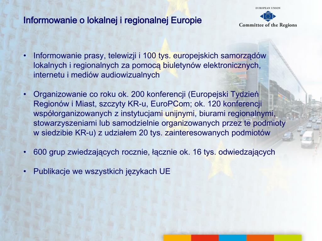 Informowanie o lokalnej i regionalnej Europie • Informowanie prasy, telewizji i 100 tys. europejskich samorządówlokalnych i regionalnych za pomocą biuletynów elektronicznych,internetui mediów audiowizualnych • Organizowanie co roku ok. 200 konferencji (Europejski Tydzień Regionówi Miast, szczyty KR-u, EuroPCom; ok. 120 konferencji współorganizowanych z instytucjami unijnymi, biurami regionalnymi, stowarzyszeniami lub samodzielnie organizowanych przez te podmioty w siedzibie KR-u) z udziałem 20 tys. zainteresowanych podmiotów • 600 grup zwiedzających rocznie, łącznie ok. 16 tys. odwiedzających • Publikacje we wszystkich językach UE