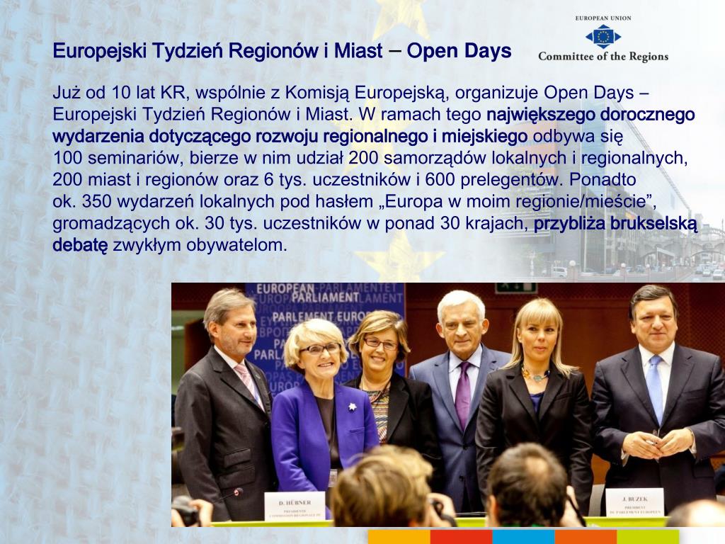 Europejski Tydzień Regionów i Miast – Open Days Już od 10 lat KR, wspólnie z Komisją Europejską, organizuje Open Days – Europejski Tydzień Regionów i Miast. W ramach tego największego dorocznego wydarzenia dotyczącego rozwoju regionalnego i miejskiego odbywa się 100 seminariów, bierze w nim udział 200 samorządów lokalnych i regionalnych, 200 miast i regionów oraz 6 tys. uczestników i 600 prelegentów. Ponadtook. 350 wydarzeń lokalnych pod hasłem „Europa w moim regionie/mieście”, gromadzących ok. 30 tys. uczestników w ponad 30 krajach, przybliża brukselską debatę zwykłym obywatelom.
