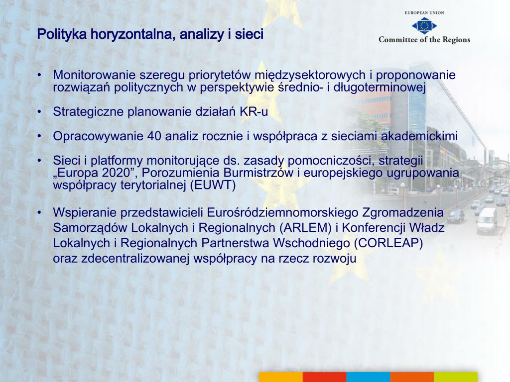 Polityka horyzontalna, analizy i sieci • Monitorowanie szeregu priorytetów międzysektorowych i proponowanie rozwiązań politycznych w perspektywie średnio- i długoterminowej • Strategiczne planowanie działań KR-u • Opracowywanie 40 analiz rocznie i współpraca z sieciami akademickimi • Sieci i platformy monitorujące ds. zasady pomocniczości, strategii„Europa 2020”, Porozumienia Burmistrzów i europejskiego ugrupowania współpracy terytorialnej (EUWT) • Wspieranie przedstawicieli Eurośródziemnomorskiego Zgromadzenia Samorządów Lokalnych i Regionalnych (ARLEM) i Konferencji Władz Lokalnych i Regionalnych Partnerstwa Wschodniego (CORLEAP)oraz zdecentralizowanej współpracy na rzecz rozwoju