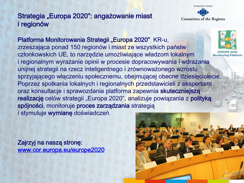 Strategia „Europa 2020”: angażowanie miast i regionów Platforma Monitorowania Strategii „Europa 2020” KR-u,zrzeszająca ponad 150 regionów i miast ze wszystkich państwczłonkowskich UE, to narzędzie umożliwiające władzom lokalnymi regionalnym wyrażanie opinii w procesie dopracowywania i wdrażaniaunijnej strategii na rzecz inteligentnego i zrównoważonego wzrostu sprzyjającego włączeniu społecznemu, obejmującej obecne dziesięciolecie.Poprzez spotkania lokalnych i regionalnych przedstawicieli z ekspertamioraz konsultacje i sprawozdania platforma zapewnia skuteczniejsząrealizację celów strategii „Europa 2020”, analizuje powiązania z polityką spójności, monitoruje proces zarządzania strategiąi stymuluje wymianę doświadczeń. Zajrzyj na naszą stronę:www.cor.europa.eu/europe2020
