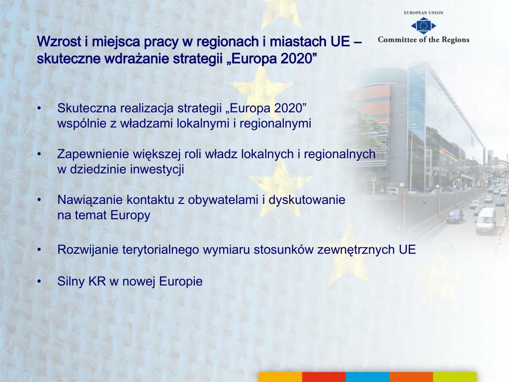 Wzrost i miejsca pracy w regionach i miastach UE – skuteczne wdrażanie strategii „Europa 2020” • Skuteczna realizacja strategii „Europa 2020”wspólniez władzami lokalnymi i regionalnymi • Zapewnienie większej roli władz lokalnych i regionalnychw dziedzinie inwestycji • Nawiązanie kontaktu z obywatelami i dyskutowaniena temat Europy • Rozwijanie terytorialnego wymiaru stosunków zewnętrznych UE • Silny KR w nowej Europie