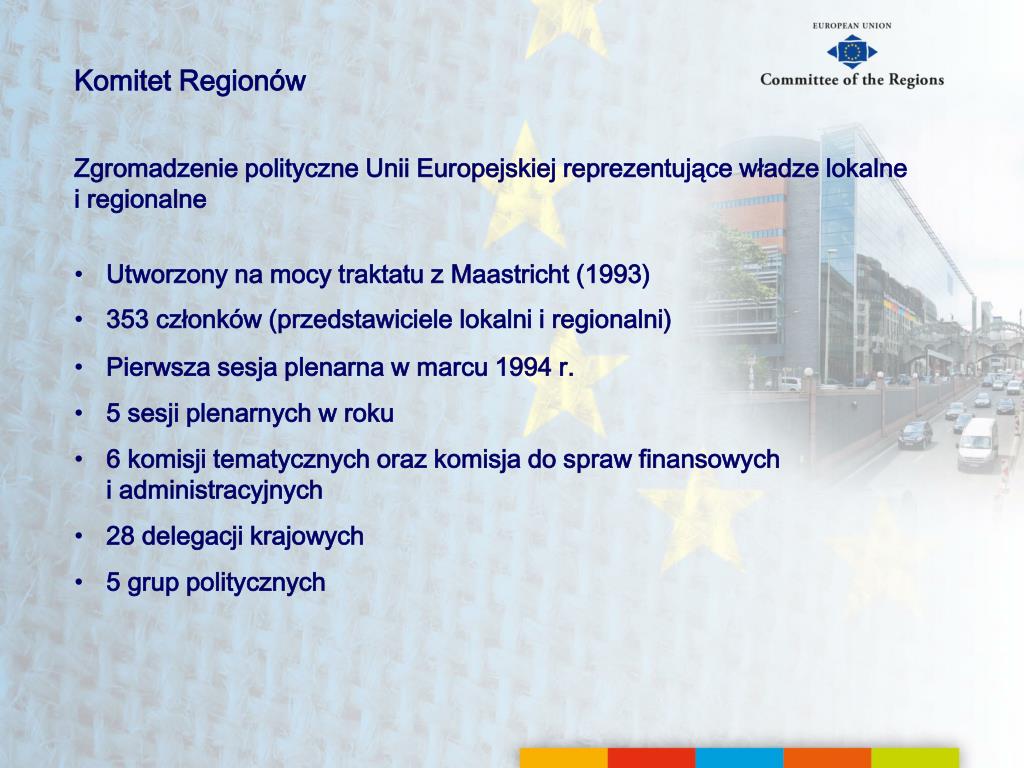 Komitet Regionów Zgromadzenie polityczne Unii Europejskiej reprezentujące władze lokalnei regionalne • Utworzony na mocy traktatu z Maastricht (1993) • 353 członków (przedstawiciele lokalni i regionalni) • Pierwsza sesja plenarna w marcu 1994 r. • 5 sesji plenarnych w roku • 6 komisji tematycznych oraz komisja do spraw finansowychi administracyjnych • 28 delegacji krajowych • 5 grup politycznych