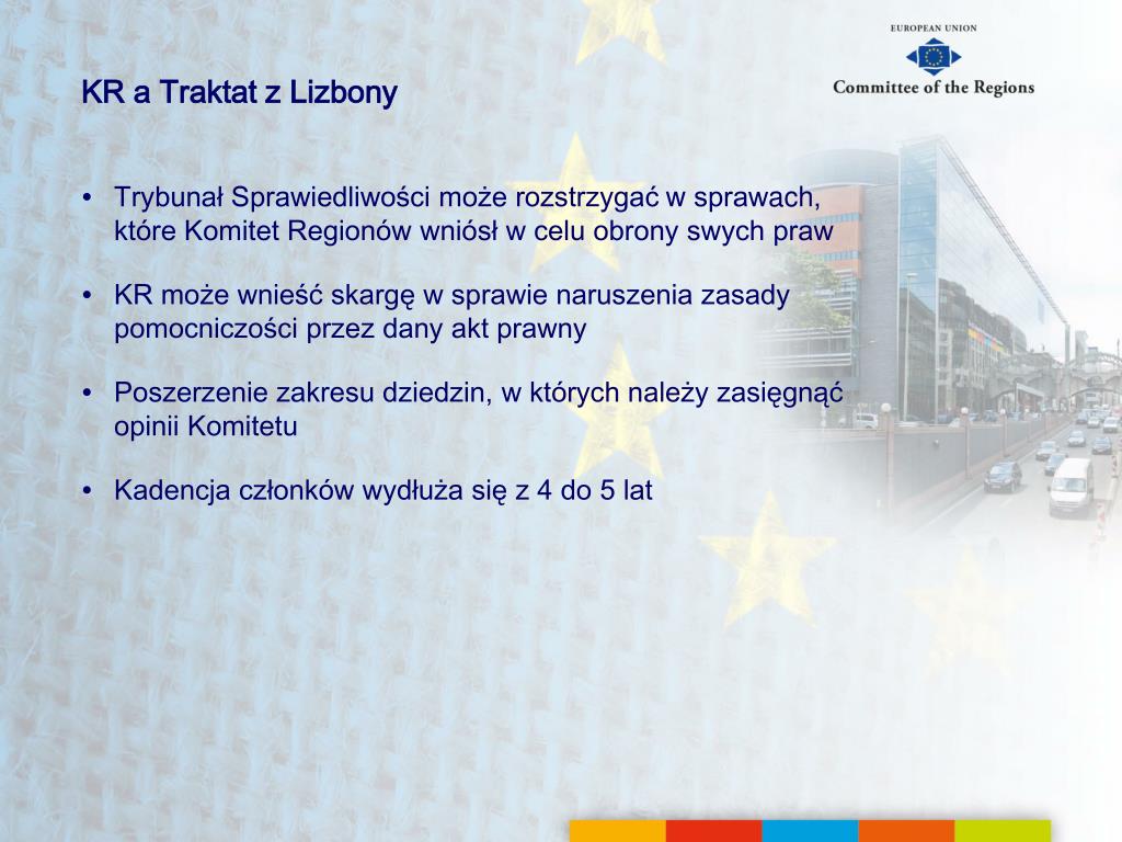 KR a Traktat z Lizbony ∙ Trybunał Sprawiedliwości może rozstrzygać w sprawach,które Komitet Regionów wniósł w celu obrony swych praw ∙ KR może wnieść skargę w sprawie naruszenia zasady pomocniczości przez dany akt prawny ∙ Poszerzenie zakresu dziedzin, w których należy zasięgnąćopinii Komitetu ∙ Kadencja członków wydłuża się z 4 do 5 lat
