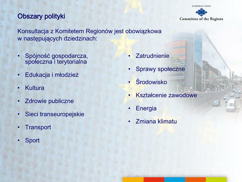 Obszary polityki Konsultacja z Komitetem Regionów jest obowiązkowa w następujących dziedzinach: • Spójność gospodarcza,społecznai terytorialna • Edukacja i młodzież • Kultura • Zdrowie publiczne • Sieci transeuropejskie • Transport • Sport • Zatrudnienie • Sprawy społeczne • Środowisko • Kształcenie zawodowe • Energia • Zmiana klimatu