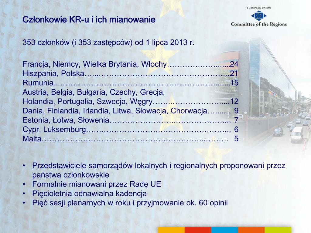 Członkowie KR-u i ich mianowanie 353 członków (i 353 zastępców) od 1 lipca 2013 r. Francja, Niemcy, Wielka Brytania, Włochy………….……....... Hiszpania, Polska…...………………………………………….... Rumunia...……………………………………………………....... Austria, Belgia, Bułgaria, Czechy, Grecja, Holandia, Portugalia, Szwecja, Węgry……..………………..... Dania, Finlandia, Irlandia, Litwa, Słowacja, Chorwacja…....... Estonia, Łotwa, Słowenia……………………..……………….... Cypr, Luksemburg…….………………….……………….……... Malta………………………………………….…………...……… 24 21 15 12 9 7 6 5 • Przedstawiciele samorządów lokalnych i regionalnych proponowani przez państwa członkowskie • Formalnie mianowani przez Radę UE • Pięcioletnia odnawialna kadencja • Pięć sesji plenarnych w roku i przyjmowanie ok. 60 opinii