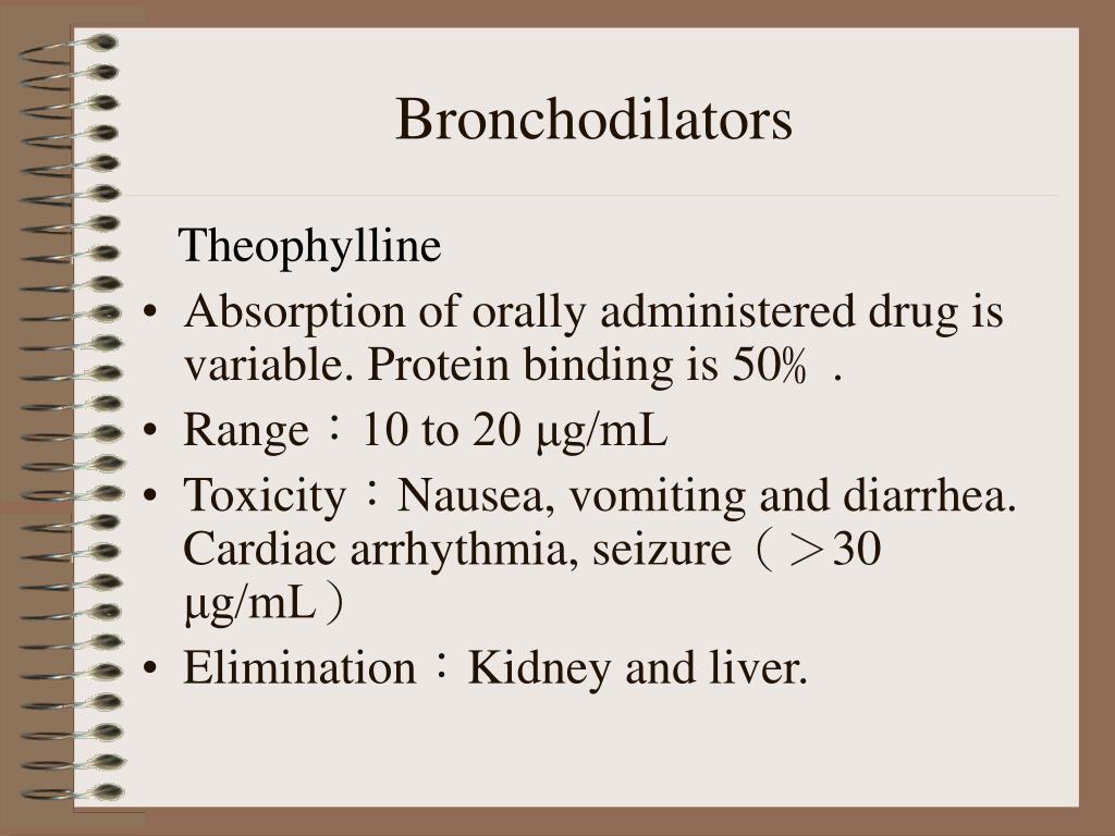 Bronchodilators Theophylline • Absorption of orally administered drug is variable. Protein binding is 50﹪. • Range:10 to 20 μg/mL • Toxicity:Nausea, vomiting and diarrhea. Cardiac arrhythmia, seizure(>30 μg/mL) • Elimination:Kidney and liver.