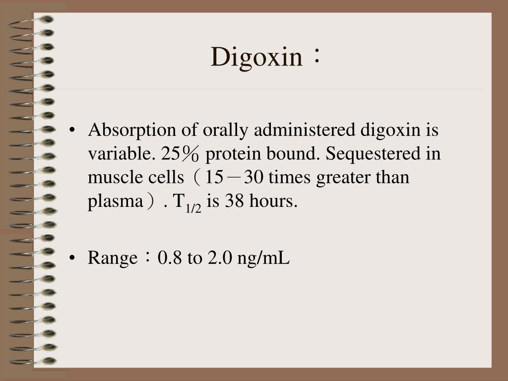 Digoxin: • Absorption of orally administered digoxin is variable. 25% protein bound. Sequestered in muscle cells(15-30 times greater than plasma). T1/2 is 38 hours. • Range:0.8 to 2.0 ng/mL