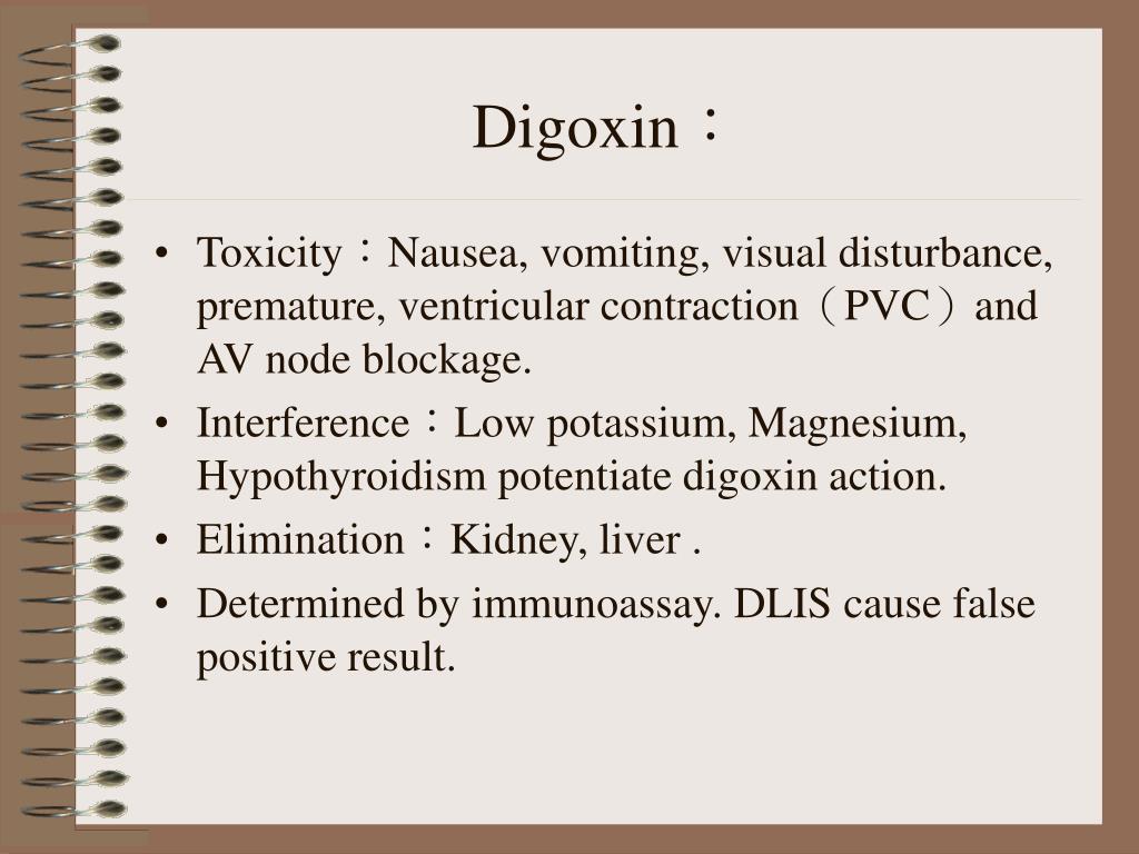 Digoxin: • Toxicity:Nausea, vomiting, visual disturbance, premature, ventricular contraction(PVC)and AV node blockage. • Interference:Low potassium, Magnesium, Hypothyroidism potentiate digoxin action. • Elimination:Kidney, liver . • Determined by immunoassay. DLIS cause false positive result.
