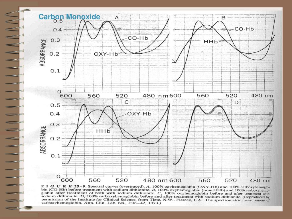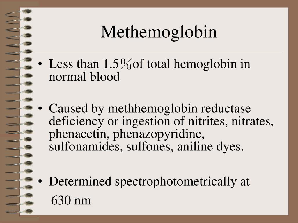 Methemoglobin • Less than 1.5%of total hemoglobin in normal blood • Caused by methhemoglobin reductase deficiency or ingestion of nitrites, nitrates, phenacetin, phenazopyridine, sulfonamides, sulfones, aniline dyes. • Determined spectrophotometrically at 630 nm
