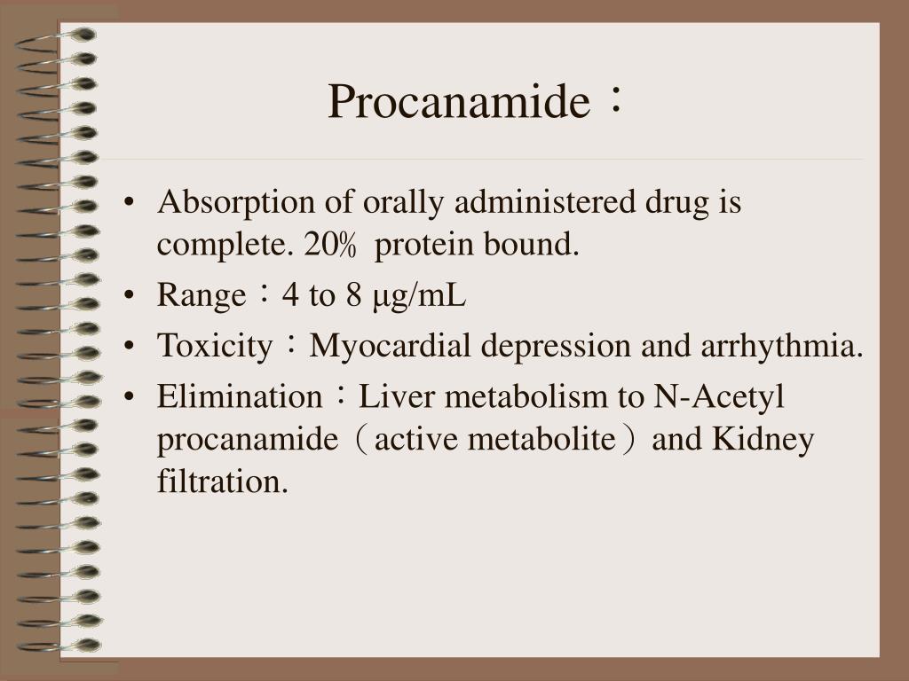 Procanamide: • Absorption of orally administered drug is complete. 20﹪protein bound. • Range:4 to 8 μg/mL • Toxicity:Myocardial depression and arrhythmia. • Elimination:Liver metabolism to N-Acetyl procanamide(active metabolite)and Kidney filtration.