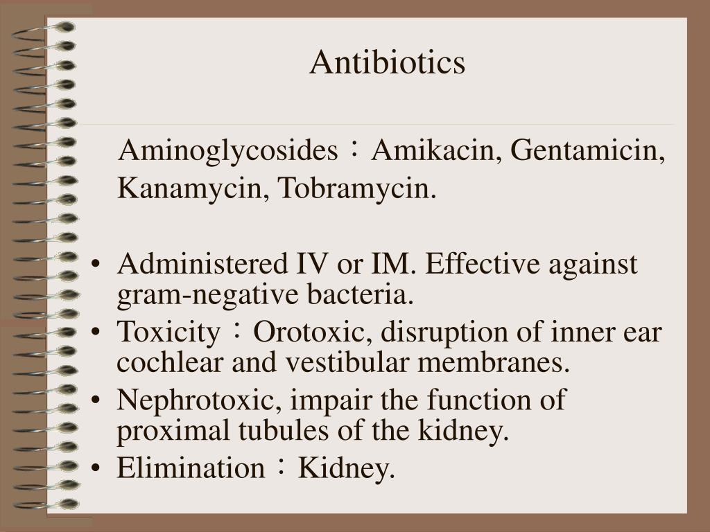 Antibiotics Aminoglycosides:Amikacin, Gentamicin, Kanamycin, Tobramycin. • Administered IV or IM. Effective against gram-negative bacteria. • Toxicity:Orotoxic, disruption of inner ear cochlear and vestibular membranes. • Nephrotoxic, impair the function of proximal tubules of the kidney. • Elimination:Kidney.