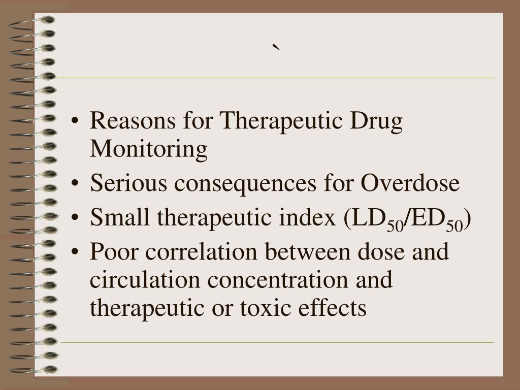 ` • Reasons for Therapeutic Drug Monitoring • Serious consequences for Overdose • Small therapeutic index (LD50/ED50) • Poor correlation between dose and circulation concentration and therapeutic or toxic effects