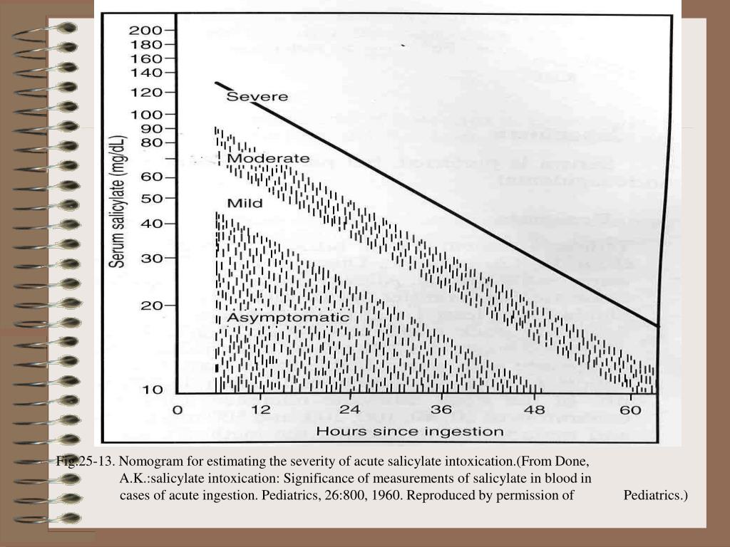 Fig.25-13. Nomogram for estimating the severity of acute salicylate intoxication.(From Done, A.K.:salicylate intoxication: Significance of measurements of salicylate in blood in cases of acute ingestion. Pediatrics, 26:800, 1960. Reproduced by permission of Pediatrics.)