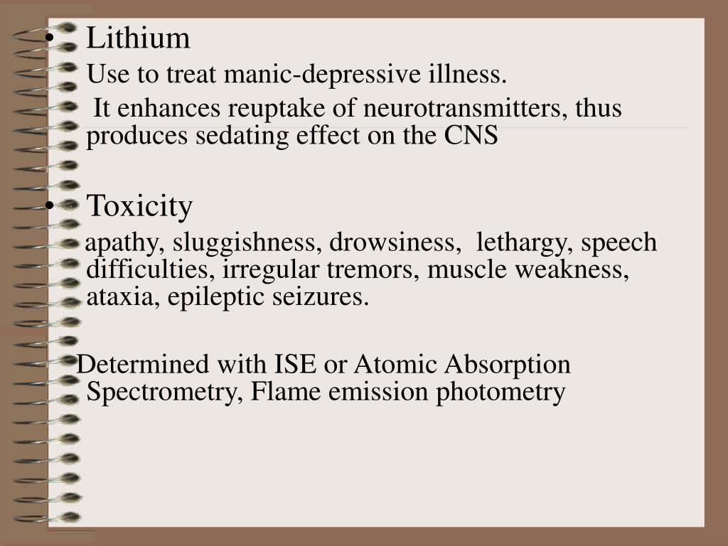 Lithium Use to treat manic-depressive illness. It enhances reuptake of neurotransmitters, thus produces sedating effect on the CNS • Toxicity apathy, sluggishness, drowsiness, lethargy, speech difficulties, irregular tremors, muscle weakness, ataxia, epileptic seizures. Determined with ISE or Atomic Absorption Spectrometry, Flame emission photometry