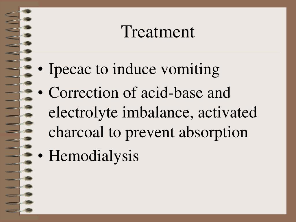 Treatment • Ipecac to induce vomiting • Correction of acid-base and electrolyte imbalance, activated charcoal to prevent absorption • Hemodialysis