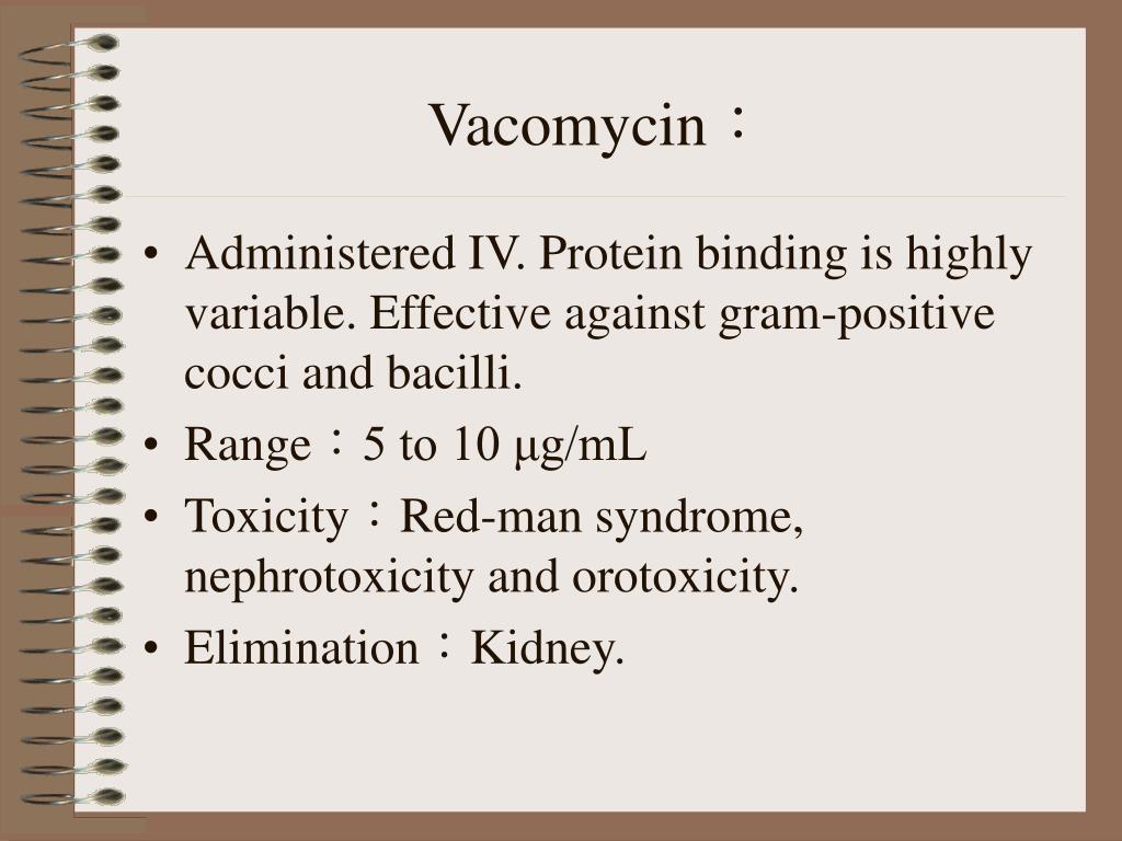 Vacomycin: • Administered IV. Protein binding is highly variable. Effective against gram-positive cocci and bacilli. • Range:5 to 10 μg/mL • Toxicity:Red-man syndrome, nephrotoxicity and orotoxicity. • Elimination:Kidney.