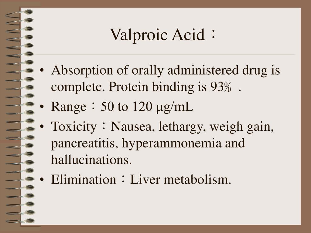 Valproic Acid: • Absorption of orally administered drug is complete. Protein binding is 93﹪. • Range:50 to 120 μg/mL • Toxicity:Nausea, lethargy, weigh gain, pancreatitis, hyperammonemia and hallucinations. • Elimination:Liver metabolism.