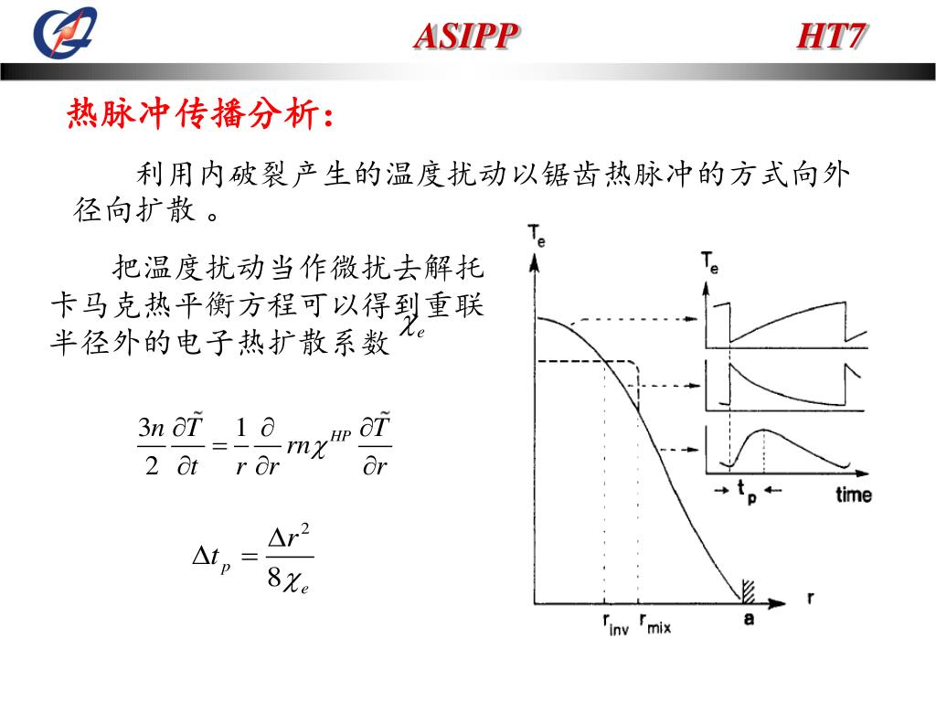 ASIPP HT7 热脉冲传播分析: 利用内破裂产生的温度扰动以锯齿热脉冲的方式向外径向扩散。 把温度扰动当作微扰去解托卡马克热平衡方程可以得到重联半径外的电子热扩散系数