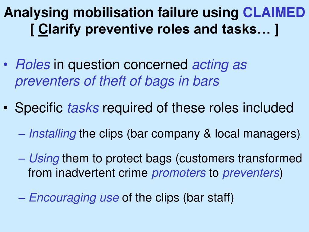 Analysing mobilisation failure using CLAIMED [ Clarify preventive roles and tasks… ] • Rolesin question concerned acting as preventers of theft of bags in bars • Specific tasksrequired of these roles included • Installingthe clips (bar company & local managers) • Usingthem to protect bags (customers transformed from inadvertent crime promoterstopreventers) • Encouraging useof the clips (bar staff)