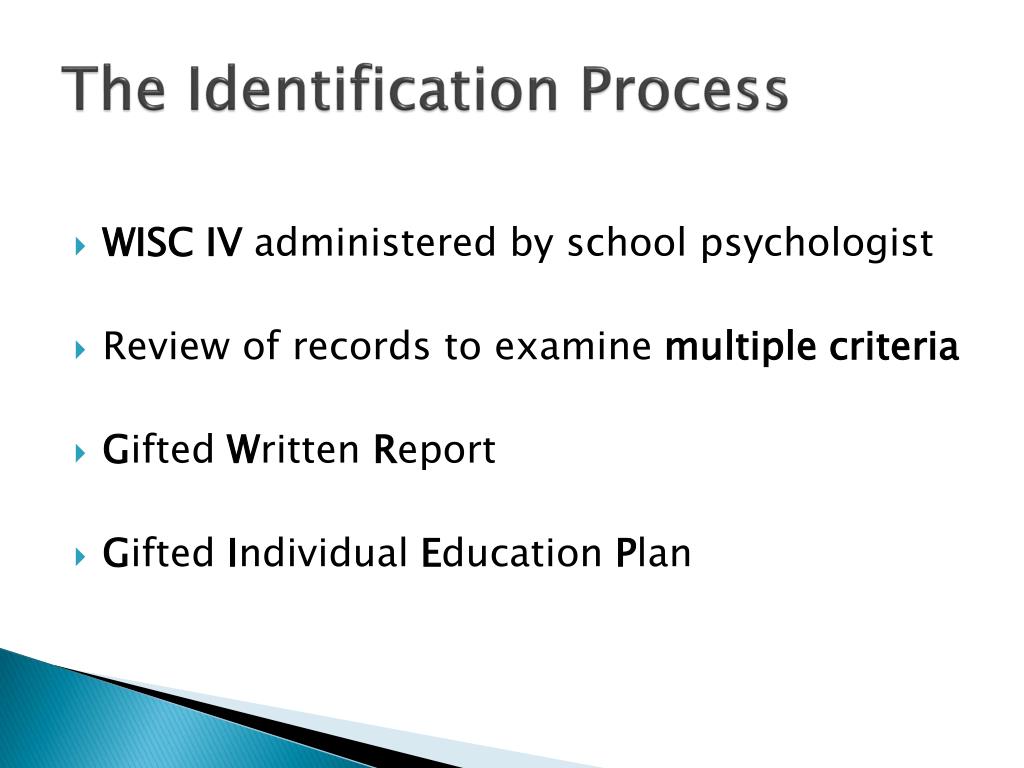 The Identification Process • WISC IV administered by school psychologist • Review of records to examine multiple criteria • Gifted Written Report • Gifted Individual Education Plan