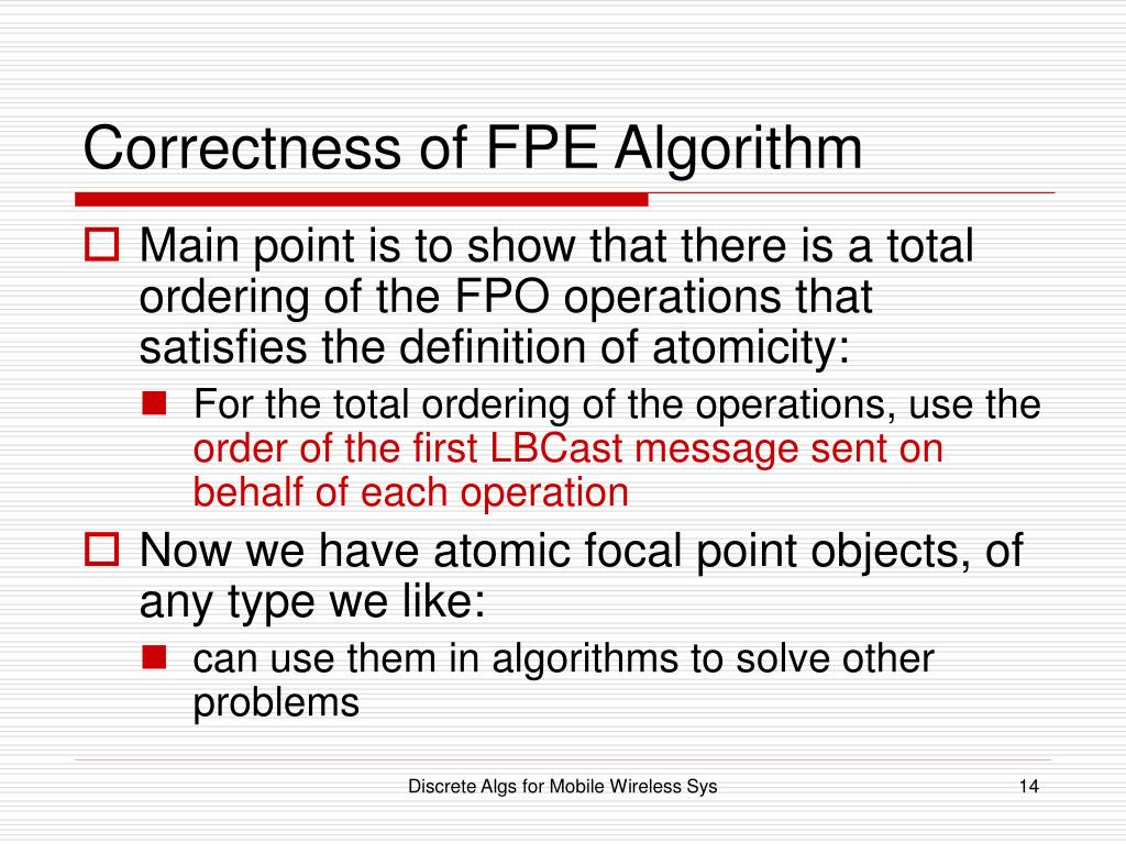 Correctness of FPE Algorithm • Main point is to show that there is a total ordering of the FPO operations that satisfies the definition of atomicity: • For the total ordering of the operations, use the order of the first LBCast message sent on behalf of each operation • Now we have atomic focal point objects, of any type we like: • can use them in algorithms to solve other problems Discrete Algs for Mobile Wireless Sys