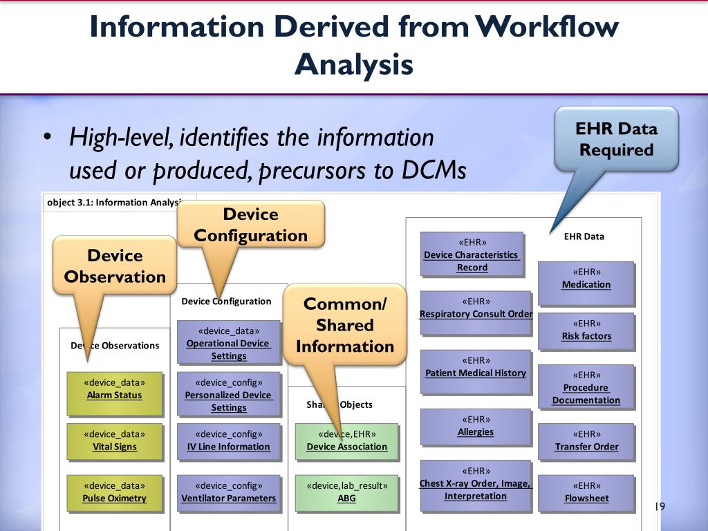 Information Derived from Workflow Analysis EHR Data Required • High-level, identifies the information used or produced, precursors to DCMs Device Configuration Device Observation Common/Shared Information