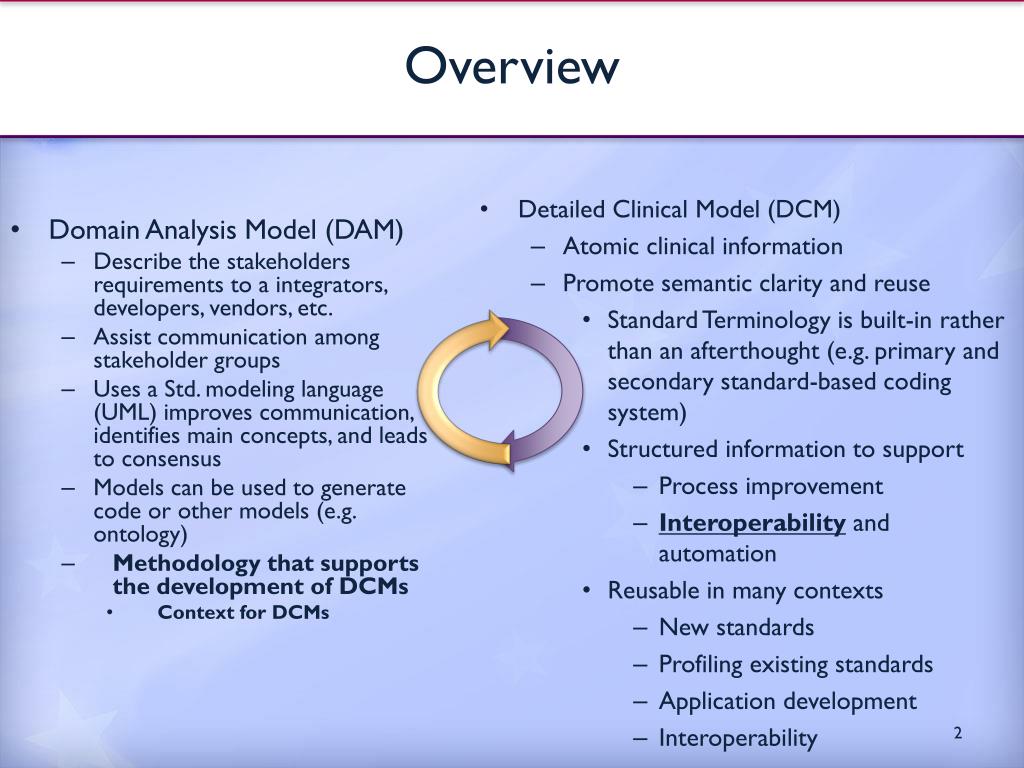 Overview • Detailed Clinical Model (DCM) • Atomic clinical information • Promote semantic clarity and reuse • Standard Terminology is built-in rather than an afterthought (e.g. primary and secondary standard-based coding system) • Structured information to support • Process improvement • Interoperability and automation • Reusable in many contexts • New standards • Profiling existing standards • Application development • Interoperability • Domain Analysis Model (DAM) • Describe the stakeholders requirements to a integrators, developers, vendors, etc. • Assist communication among stakeholder groups • Uses a Std. modeling language (UML) improves communication, identifies main concepts, and leads to consensus • Models can be used to generate code or other models (e.g. ontology) • Methodology that supports the development of DCMs • Context for DCMs