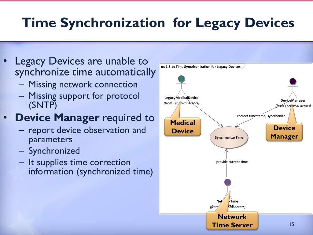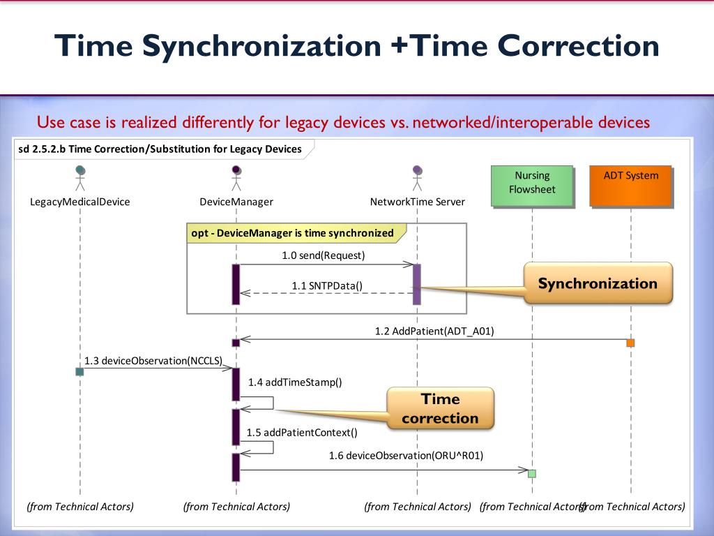 Time Synchronization +Time Correction Use case is realized differently for legacy devices vs. networked/interoperable devices Synchronization Time correction