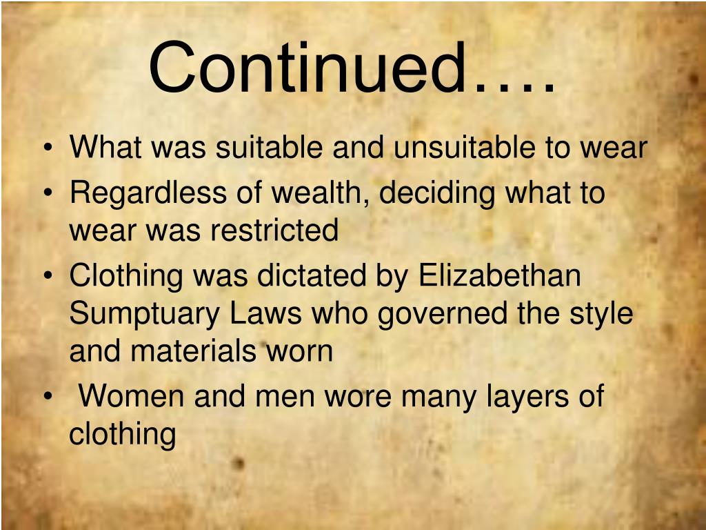 Continued…. • What was suitable and unsuitable to wear • Regardless of wealth, deciding what to wear was restricted • Clothing was dictated by Elizabethan Sumptuary Laws who governed the style and materials worn • Women and men wore many layers of clothing