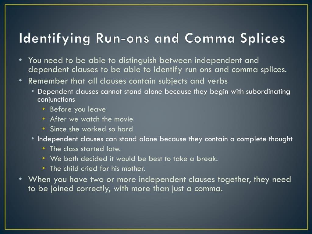 Identifying Run-ons and Comma Splices • You need to be able to distinguish between independent and dependent clauses to be able to identify run ons and comma splices. • Remember that all clauses contain subjects and verbs • Dependent clauses cannot stand alone because they begin with subordinating conjunctions • Before you leave • After we watch the movie • Since she worked so hard • Independent clauses can stand alone because they contain a complete thought • The class started late. • We both decided it would be best to take a break. • The child cried for his mother. • When you have two or more independent clauses together, they need to be joined correctly, with more than just a comma.