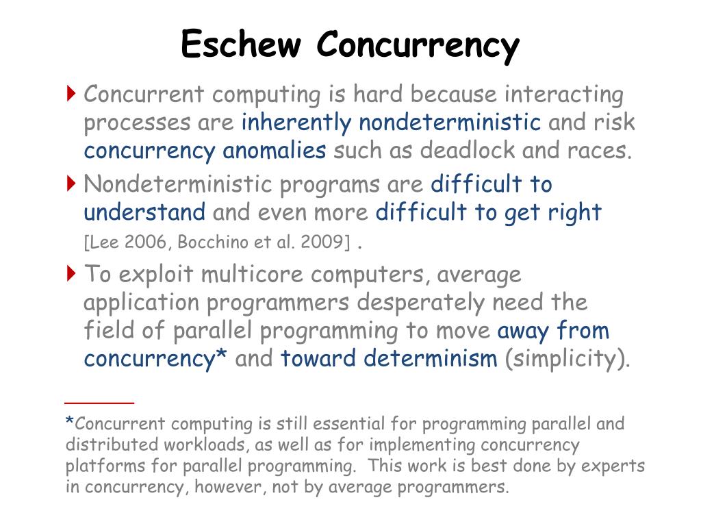 Eschew Concurrency • Concurrent computing is hard because interacting processes are inherently nondeterministic and risk concurrency anomalies such as deadlock and races. • Nondeterministic programs are difficult to understand and even more difficult to get right[Lee 2006, Bocchino et al. 2009] . • To exploit multicore computers, average application programmers desperately need the field of parallel programming to move away from concurrency* and toward determinism (simplicity). *Concurrent computing is still essential for programming parallel and distributed workloads, as well as for implementing concurrency platforms for parallel programming. This work is best done by experts in concurrency, however, not by average programmers.