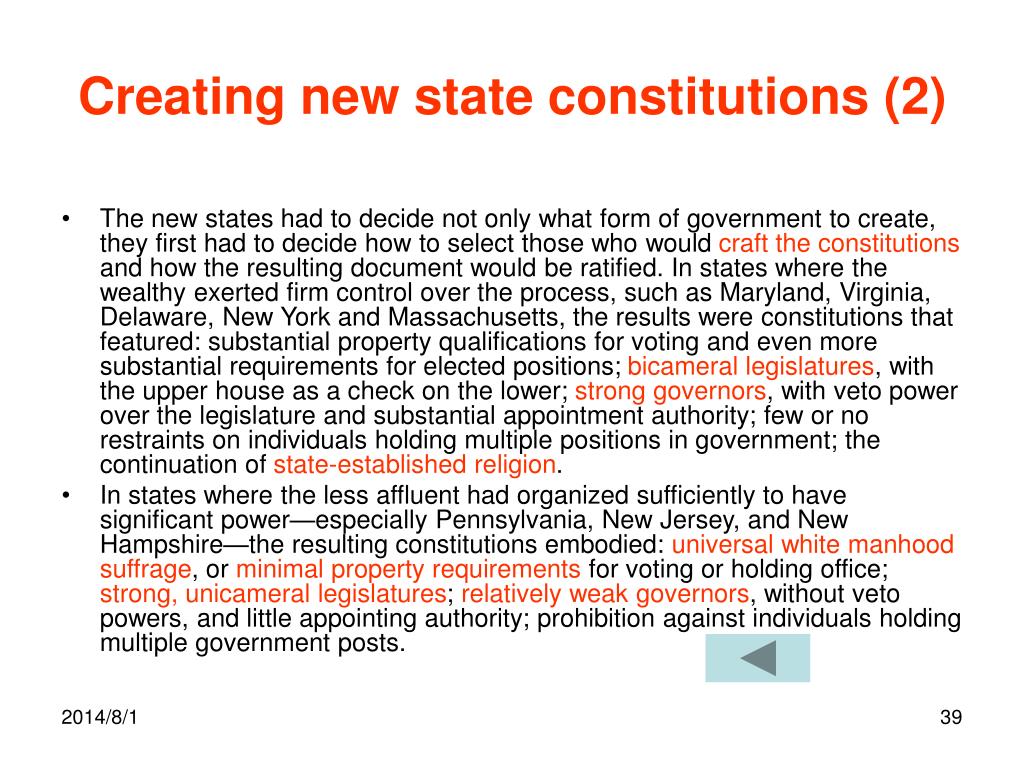 Creating new state constitutions (2) • The new states had to decide not only what form of government to create, they first had to decide how to select those who would craft the constitutions and how the resulting document would be ratified. In states where the wealthy exerted firm control over the process, such as Maryland, Virginia, Delaware, New York and Massachusetts, the results were constitutions that featured: substantial property qualifications for voting and even more substantial requirements for elected positions; bicameral legislatures, with the upper house as a check on the lower; strong governors, with veto power over the legislature and substantial appointment authority; few or no restraints on individuals holding multiple positions in government; the continuation of state-established religion. • In states where the less affluent had organized sufficiently to have significant power—especially Pennsylvania, New Jersey, and New Hampshire—the resulting constitutions embodied: universal white manhood suffrage, or minimal property requirements for voting or holding office; strong, unicameral legislatures; relatively weak governors, without veto powers, and little appointing authority; prohibition against individuals holding multiple government posts.