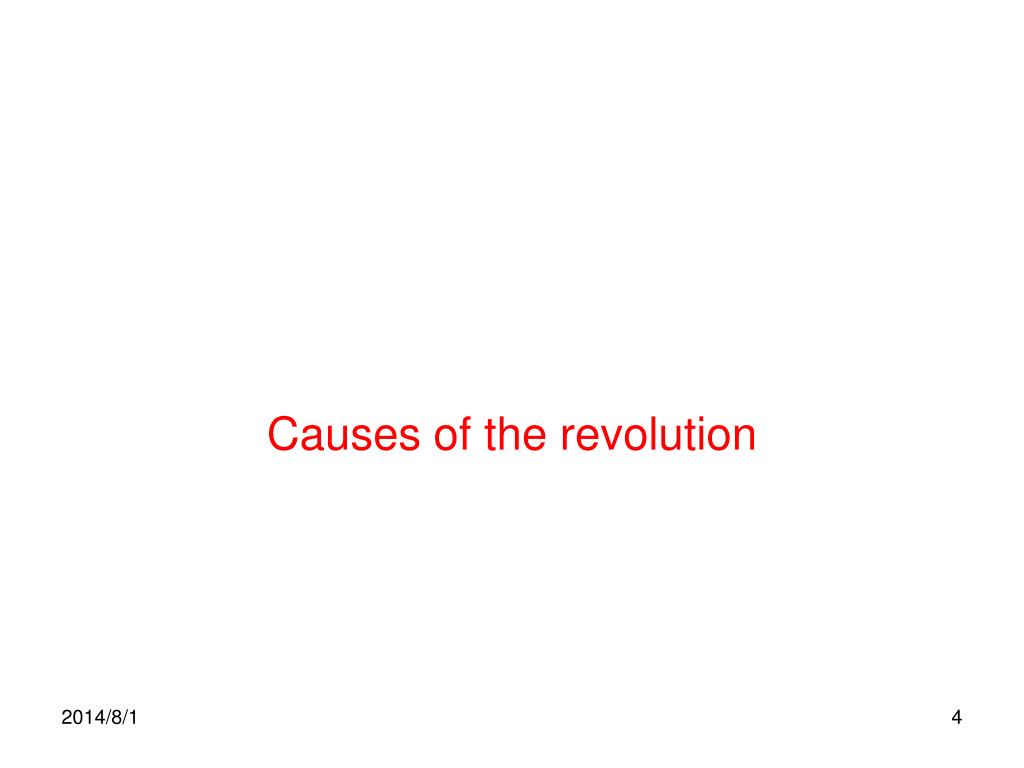 Causes of the revolution • The revolution had many causes. • Firstly, long-term social, economic, and political changes in the colonies before 1750 provided the basis for an independent nation with representative political institutions. • Next, more immediately, the French and Indian War (1754-1763) changed the relationship between the colonies and their mother country. • Finally, a decade of conflicts between the British government and the colonists, beginning with the Stamp Act crisis in 1765, led to the outbreak of war in 1775 and the Declaration of Independence in 1776.