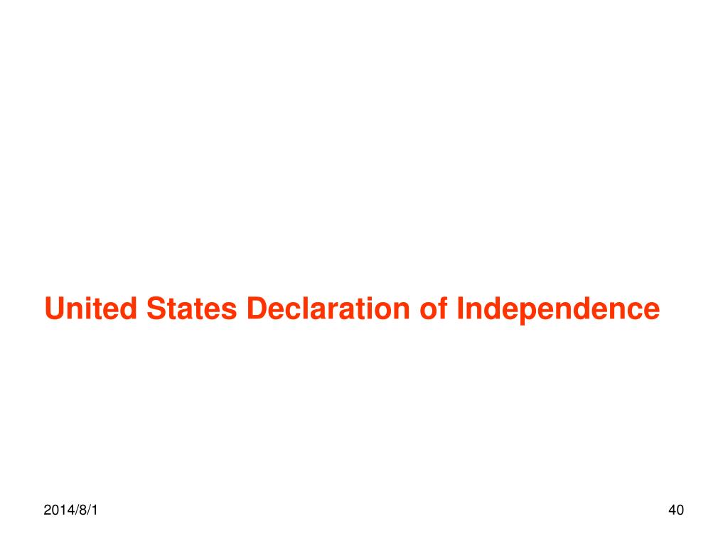 United States Declaration of Independence • On July 2, 1776, Congress declared the independence of the United States; two days later, on July 4, it adopted the Declaration of Independence, which date is now celebrated as the US Independence Day. • Until this point, the colonies had sought favorable peace terms; now all the states called for independence. • Except for a failed British attempt on September 11, 1776 to secure after the Battle of Long Island, from a Congressional delegation including John Adams and Benjamin Franklin on Staten Island, a revocation of the Declaration of Independence, there would be no negotiations until 1783.