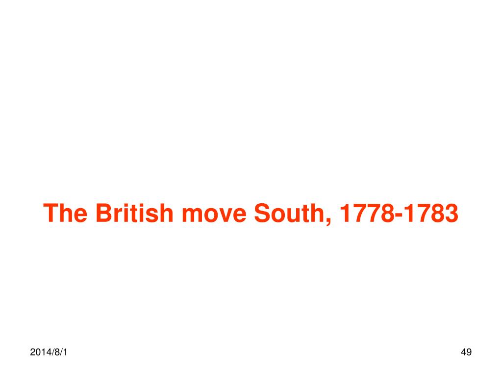 The British move South, 1778-1783 • Change of strategy: • The British strategy in America now concentrated on a campaign in the southern colonies. • Why: • With fewer regular troops at their disposal, the British commanders saw the Southern Strategy as a more viable plan, as the south was perceived as being more strongly Loyalist, with a large population of poorer recent immigrants as well as large numbers of African Americans, both groups who tended to favour them.