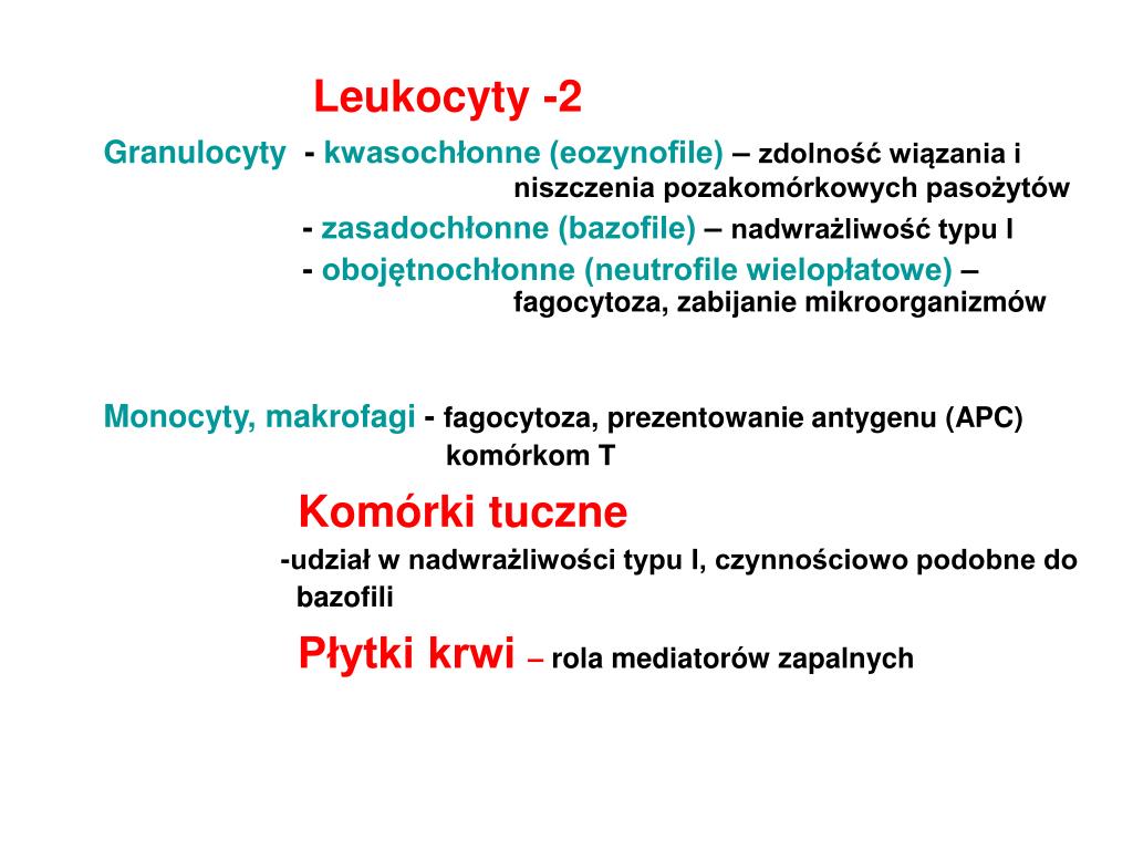 Leukocyty -2 Granulocyty - kwasochłonne (eozynofile) – zdolność wiązania iniszczenia pozakomórkowych pasożytów - zasadochłonne (bazofile) – nadwrażliwość typu I - obojętnochłonne (neutrofile wielopłatowe) – fagocytoza, zabijanie mikroorganizmów Monocyty, makrofagi - fagocytoza, prezentowanie antygenu (APC) komórkom T Komórki tuczne -udział w nadwrażliwości typu I, czynnościowo podobne do bazofili Płytki krwi – rola mediatorów zapalnych
