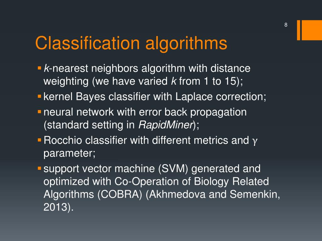 Classification algorithms • k-nearest neighbors algorithm with distance weighting (we have varied k from 1 to 15); • kernel Bayes classifier with Laplace correction; • neural network with error back propagation (standard setting in RapidMiner); • Rocchio classifier with different metrics and parameter; • support vector machine (SVM) generated and optimized with Co-Operation of Biology Related Algorithms (COBRA) (Akhmedova and Semenkin, 2013).