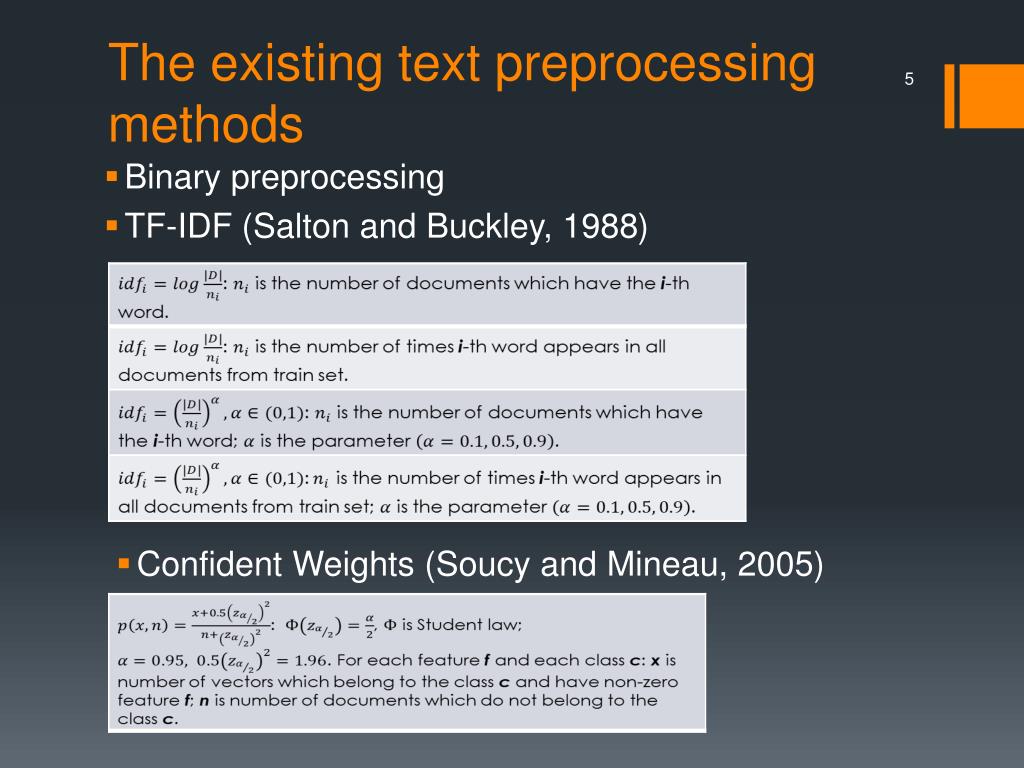 The existing text preprocessing methods • Binary preprocessing • TF-IDF (Salton and Buckley, 1988) • Confident Weights (Soucy and Mineau, 2005)