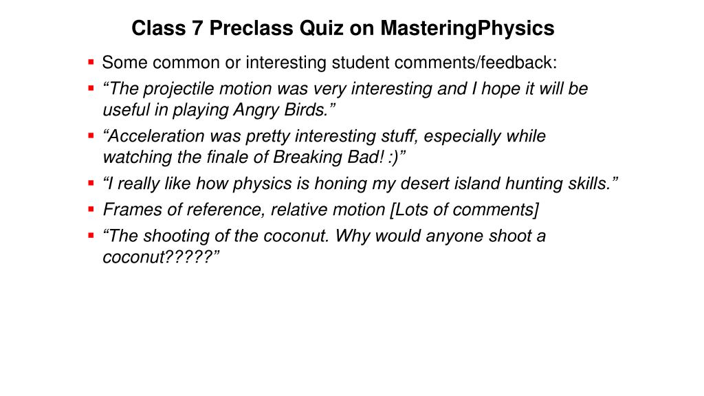 Class 7Preclass Quiz on MasteringPhysics • Some common or interesting student comments/feedback: • “The projectile motion was very interesting and I hope it will be useful in playing Angry Birds.” • “Acceleration was pretty interesting stuff, especially while watching the finale of Breaking Bad! :)” • “I really like how physics is honing my desert island hunting skills.” • Frames of reference, relative motion [Lots of comments] • “The shooting of the coconut. Why would anyone shoot a coconut?????”