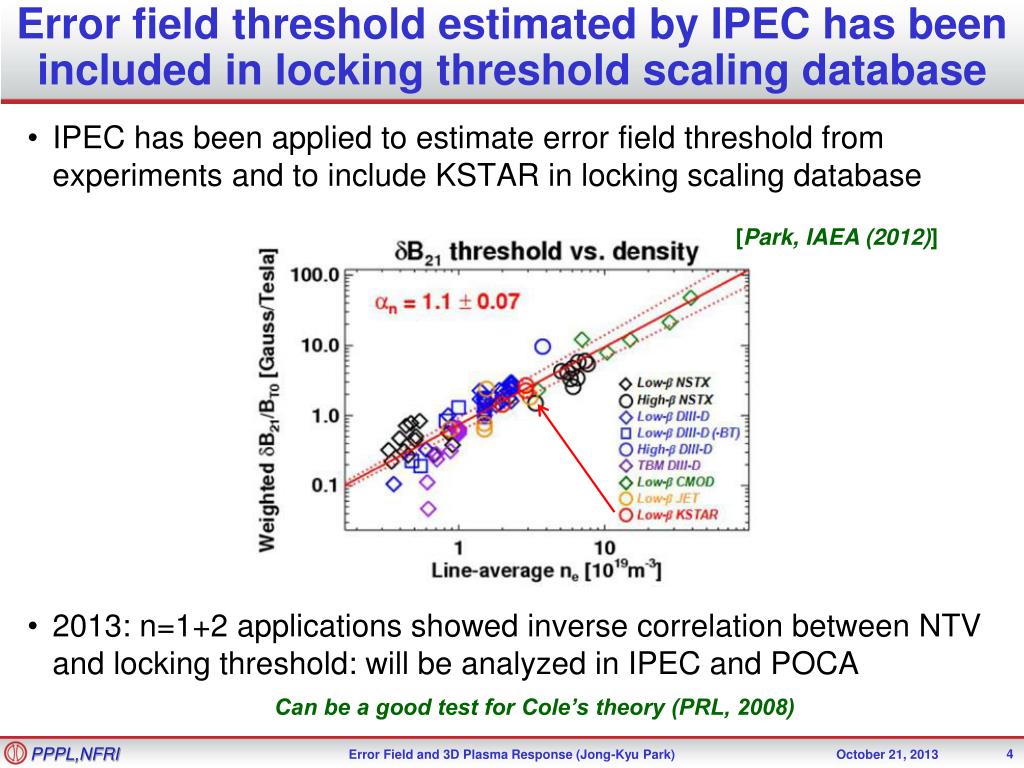 Error field threshold estimated by IPEC has been included in locking threshold scaling database • IPEC has been applied to estimate error field threshold from experiments and to include KSTAR in locking scaling database • 2013: n=1+2 applications showed inverse correlation between NTV and locking threshold: will be analyzed in IPEC and POCA [Park, IAEA (2012)] Can be a good test for Cole’s theory (PRL, 2008)