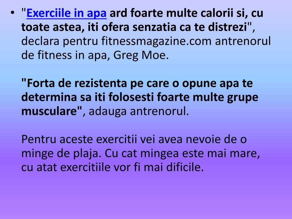 "Exerciile in apaardfoartemultecaloriisi, cu toateastea, itioferasenzatia ca tedistrezi", declarapentru fitnessmagazine.com antrenorul de fitness in apa, Greg Moe. "Forta de rezistentape care o opuneapatedeterminasaitifolosestifoartemultegrupemusculare", adaugaantrenorul. Pentruacesteexercitiiveiaveanevoie de o minge de plaja. Cu cat mingeaestemai mare, cu atatexercitiilevorfimaidificile.