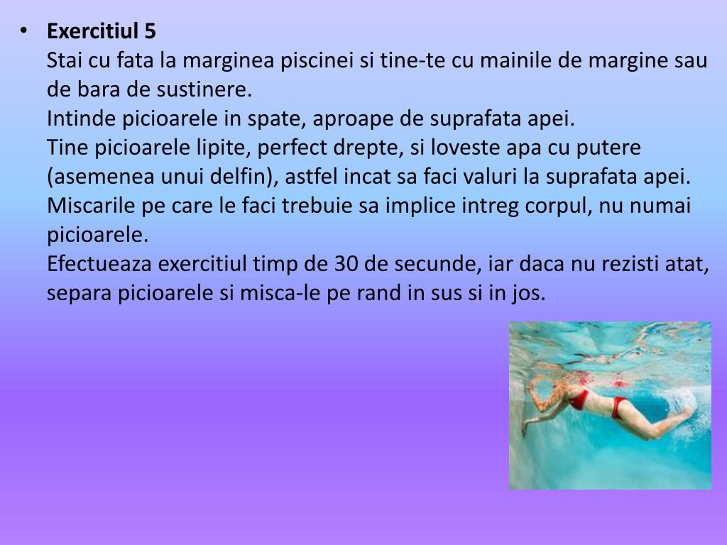 Exercitiul 5Stai cu fata la margineapiscineisi tine-te cu mainile de marginesau de bara de sustinere.Intindepicioarele in spate, aproape de suprafataapei.Tine picioarelelipite, perfect drepte, silovesteapa cu putere (asemeneaunuidelfin), astfelincatsafacivaluri la suprafataapei.Miscarilepe care le facitrebuiesaimpliceintregcorpul, nu numaipicioarele.Efectueazaexercitiultimp de 30 de secunde, iardaca nu rezistiatat, separapicioarelesimisca-le pe rand in sussi in jos.