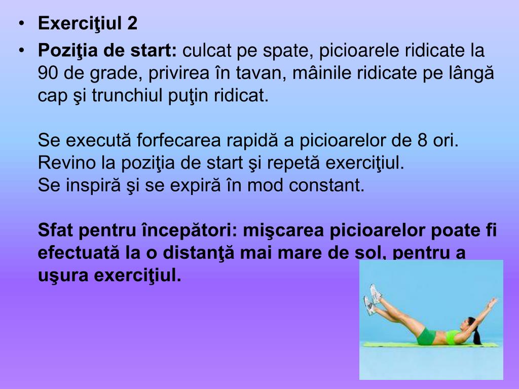 Exerciţiul 2 • Poziţia de start: culcat pe spate, picioarele ridicate la 90 de grade, privirea în tavan, mâinile ridicate pe lângă cap şi trunchiul puţin ridicat. Se execută forfecarea rapidă a picioarelor de 8 ori.Revino la poziţia de start şi repetă exerciţiul.Se inspiră şi se expiră în mod constant.Sfat pentru începători: mişcarea picioarelor poate fi efectuată la o distanţă mai mare de sol, pentru a uşura exerciţiul.