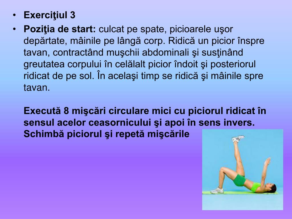 Exerciţiul 3 • Poziţia de start: culcat pe spate, picioarele uşor depărtate, mâinile pe lângă corp. Ridică un picior înspre tavan, contractând muşchii abdominali şi susţinând greutatea corpului în celălalt picior îndoit şi posteriorul ridicat de pe sol. În acelaşi timp se ridică şi mâinile spre tavan.Execută 8 mişcări circulare mici cu piciorul ridicat în sensul acelor ceasornicului şi apoi în sens invers. Schimbă piciorul şi repetă mişcările