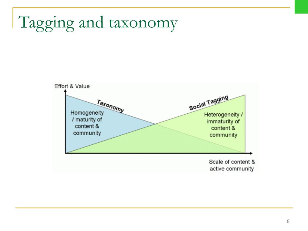 Tagging and taxonomy • Taxonomy • 由專家編制的專業層次目錄 • 由一些組織或個人為了自身的需要而編制的,如Yahoo分類目錄等。 • 分類標準是由專家制定的,不一定適合普通用戶使用。 • 獅子、老虎 豹屬 • 家貓 貓屬 • 豹屬、貓屬 貓科