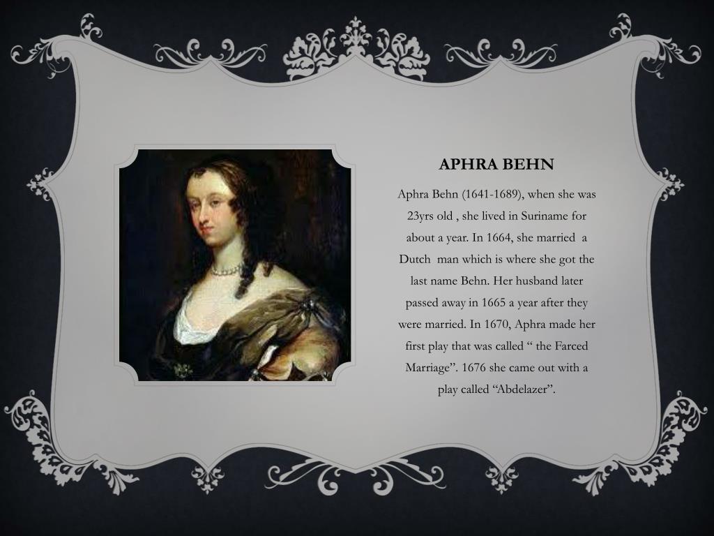 Aphra behn Aphra Behn (1641-1689), when she was 23yrs old , she lived in Suriname for about a year. In 1664, she married a Dutch man which is where she got the last name Behn. Her husband later passed away in 1665 a year after they were married. In 1670, Aphra made her first play that was called “ the Farced Marriage”. 1676 she came out with a play called “Abdelazer”.